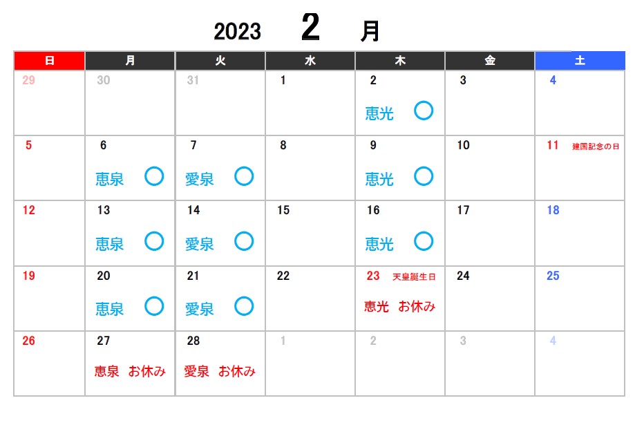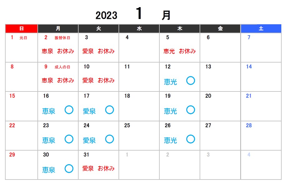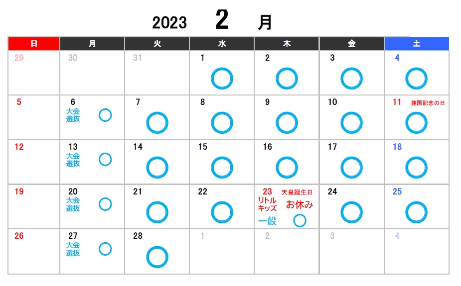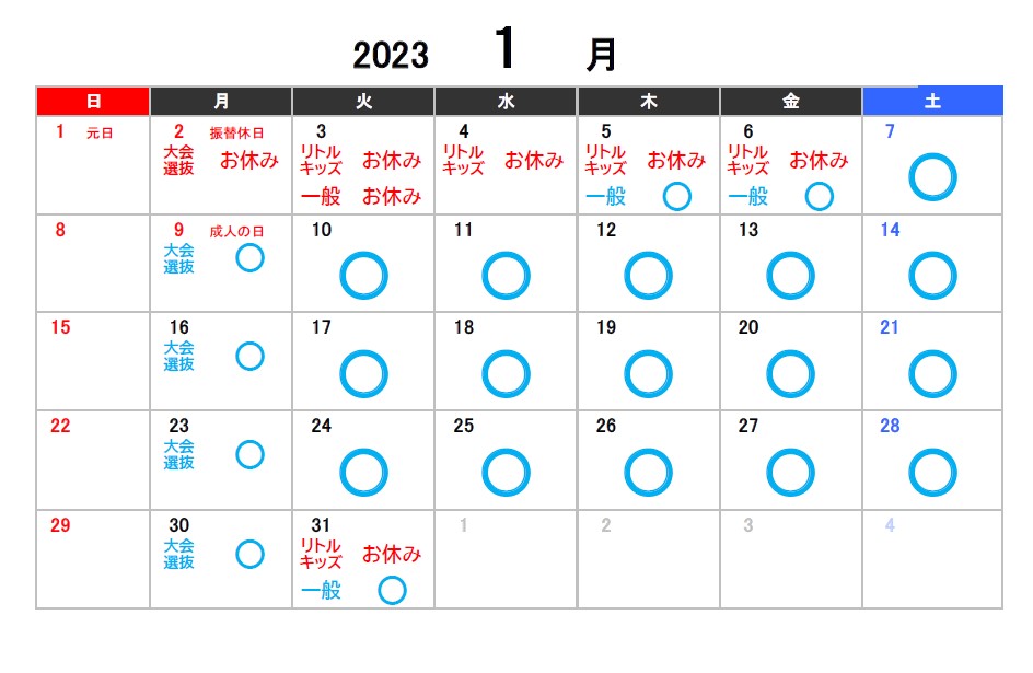 1月2月3月のお休みのお知らせ 2022.11.25 【スタジオ本校】 ※スタジオ受付定休日の日曜・月曜、またスタジオレッスンがない日は受付営業もお休みになります。ご了承ください。 【アネックス校】 Tweet Share 秋のスクールキャンペーン実施中!! 12/24(土)臨時休講のお知らせ
