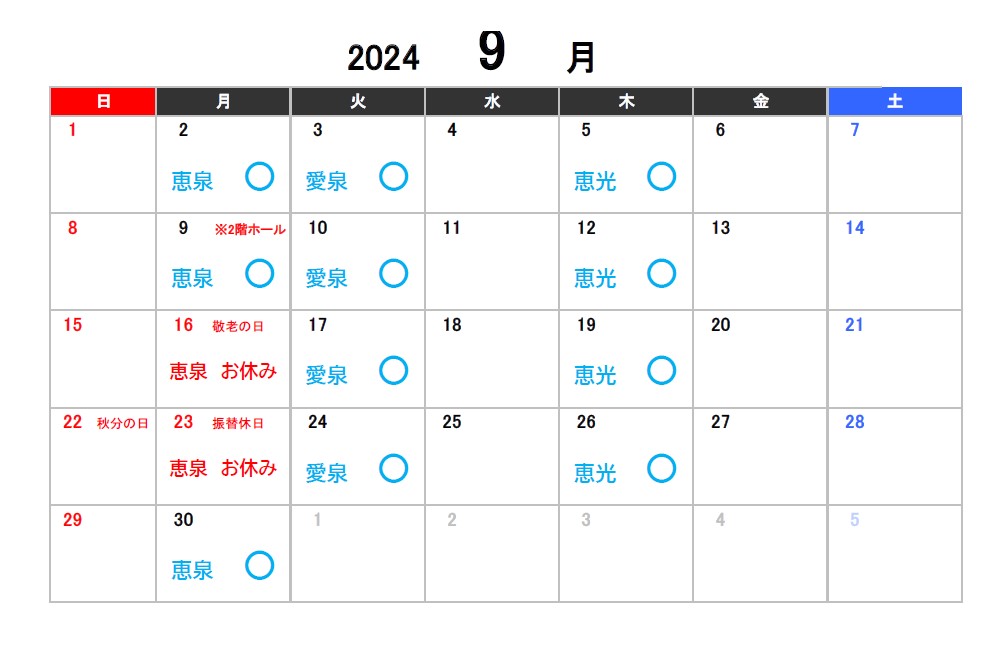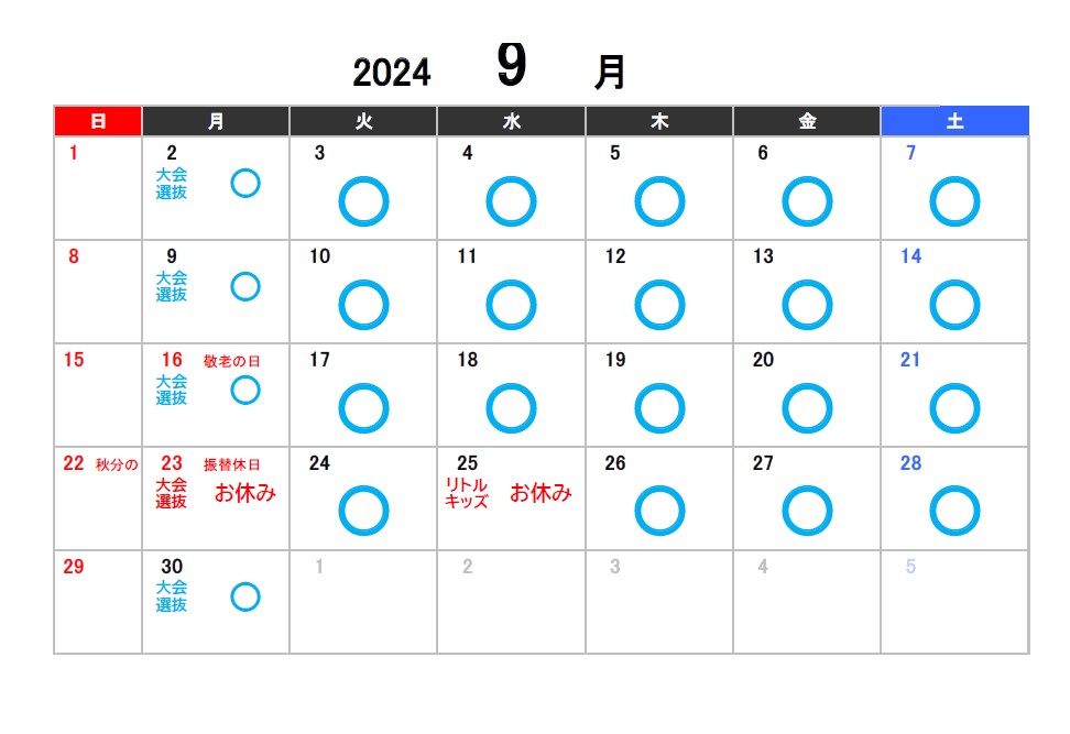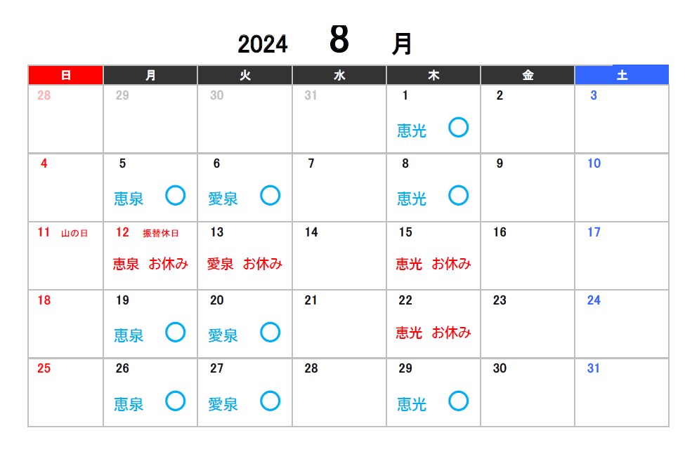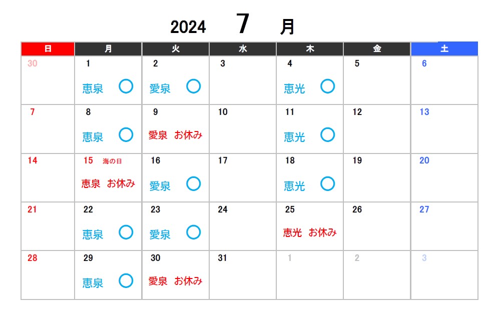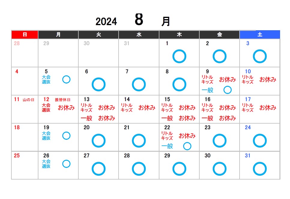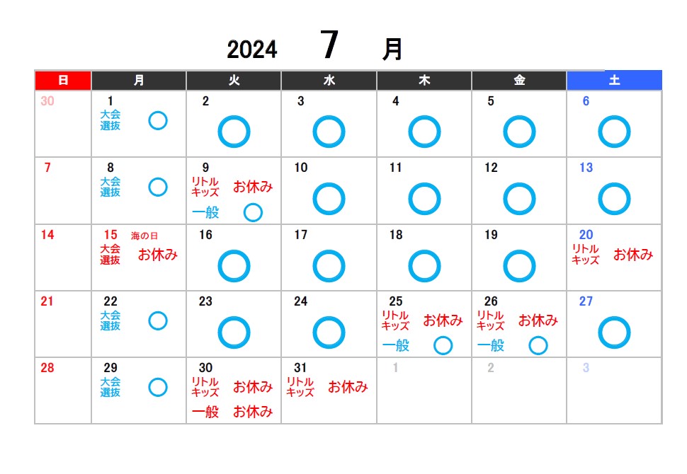 2024年7月8月9月のお休みのお知らせ 2024.05.31 【スタジオ本校】 ※スタジオ受付定休日の日曜・月曜、またスタジオレッスンがない日は受付営業もお休みになります。ご了承ください。 【アネックス校】 Tweet Share 2024年4月5月6月のお休みのお知らせ 7/2(火)受付営業時間一部臨時休業のお知らせ