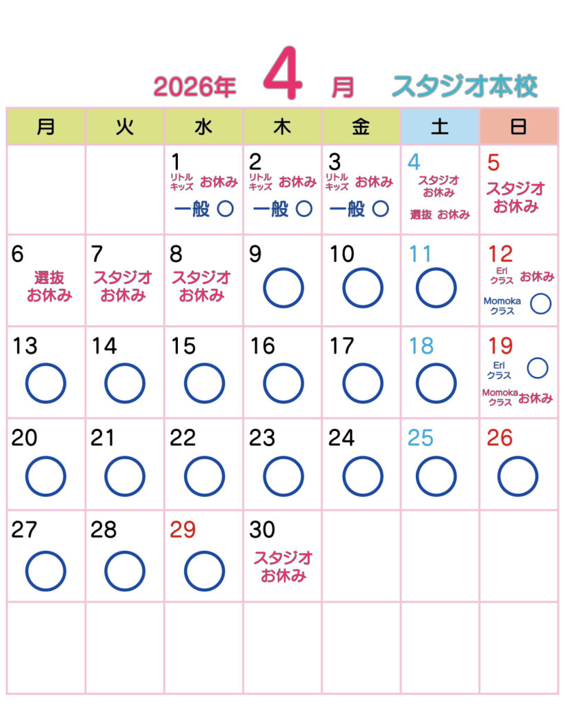 2026年4月のお休みのお知らせ 2026.03.19 【スタジオ本校】 ※スタジオ受付定休日の月曜、またスタジオレッスンがない日は受付営業もお休みになります。ご了承ください。 【アネックス校】 ※恵泉クラスについては、確定次第掲載いたします。 Tweet Share 2026年4月からの新レッスンスケジュールのお知らせ
